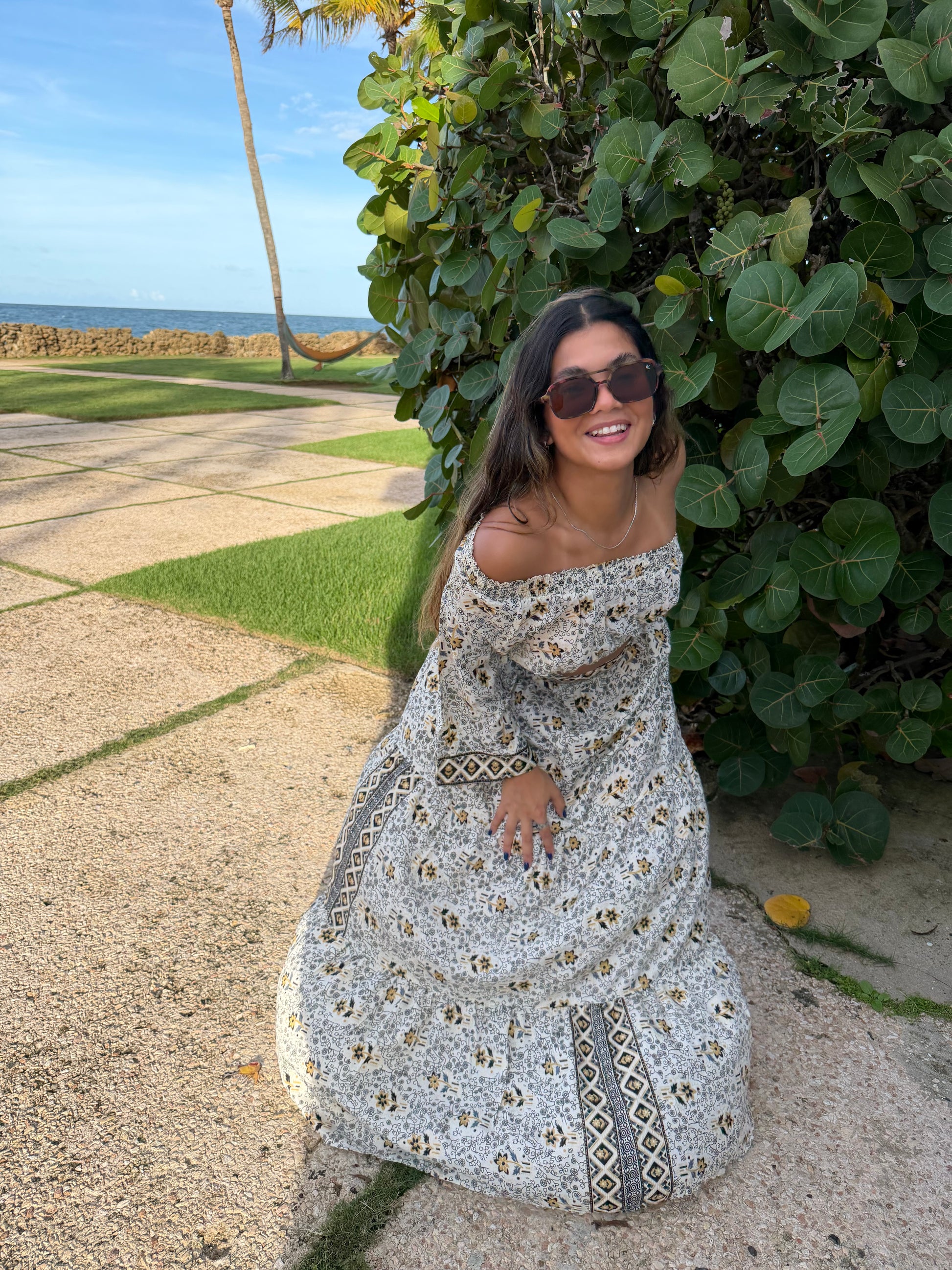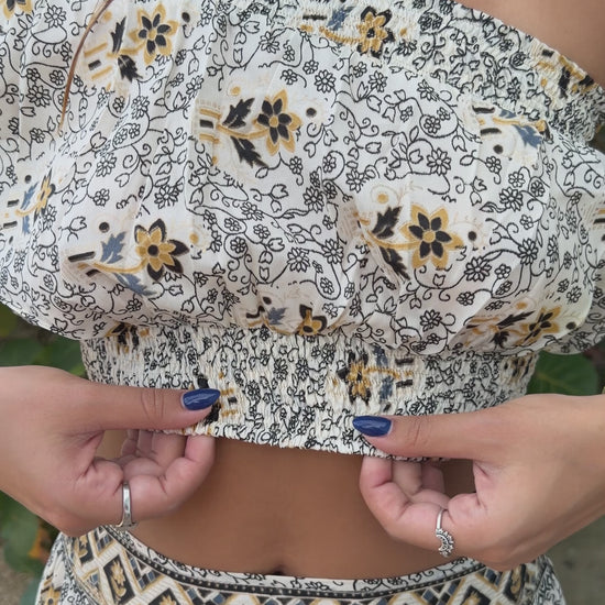 Step into effortless bohemian elegance with our Boho Breeze Two-Piece Set, designed for sun-chasing days, beachside strolls, and dreamy getaways. This matching set features a lightweight floral print in soft neutrals with warm golden accents, creating the perfect balance of relaxed and refined.