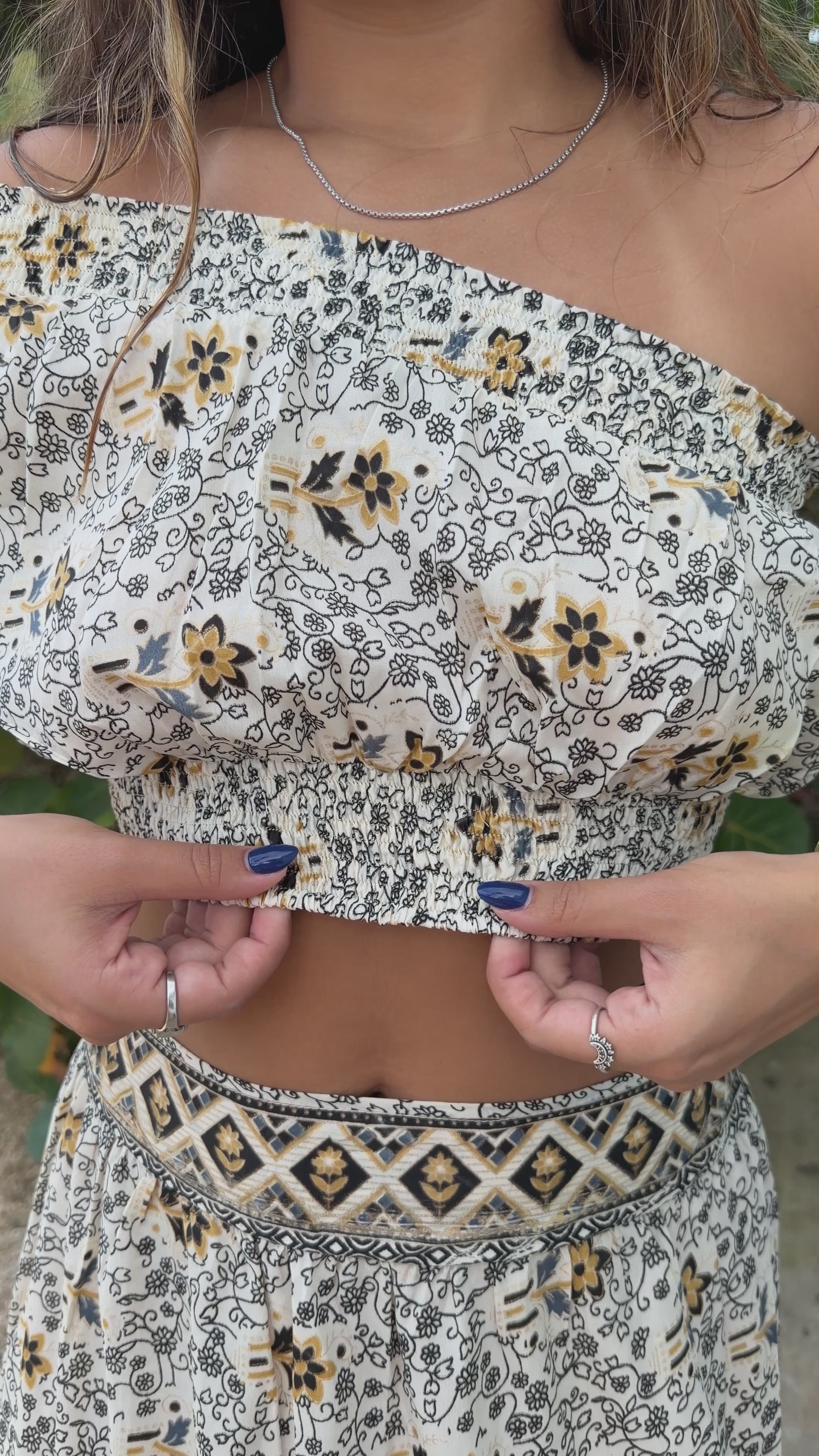 The one-shoulder crop top showcases a flowy sleeve and comfortable elastic hem for a flattering, carefree silhouette. Paired with the high-waisted maxi skirt, detailed with a beautifully patterned waistband and contrast geometric paneling, this set delivers movement, charm, and statement-making boho style in every step.